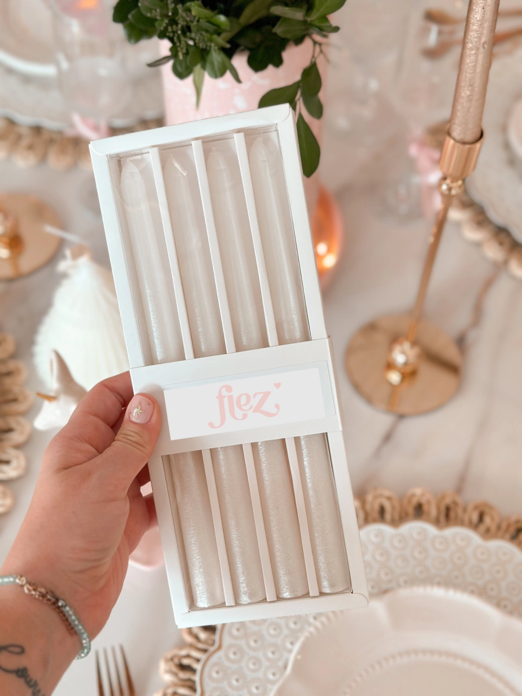 Ilumina tus momentos especiales con nuestro exclusivo set de velas blanco nácar. Cada vela, cuidadosamente elaborada, no solo ofrece una luz suave y cálida, sino que también añade un toque de elegancia a cualquier decoración.